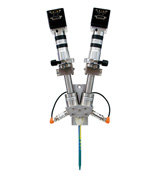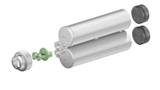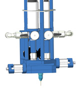 Die Kartuschen werden mit einer speziellen Halterung über ein Schnellwechselsystem fixiert. Die Stößel werden hierbei über eine doppelseitige Linearführung fixiert und dadurch präzise gehalten. Verschiedene Mischrohre können auf den Prozess abgestimmt werden. Das Kartuschensystem kann durch gefräste Langlöcher an die jeweilige Gehäusehöhe in Z-Höhe angepasst werden. |